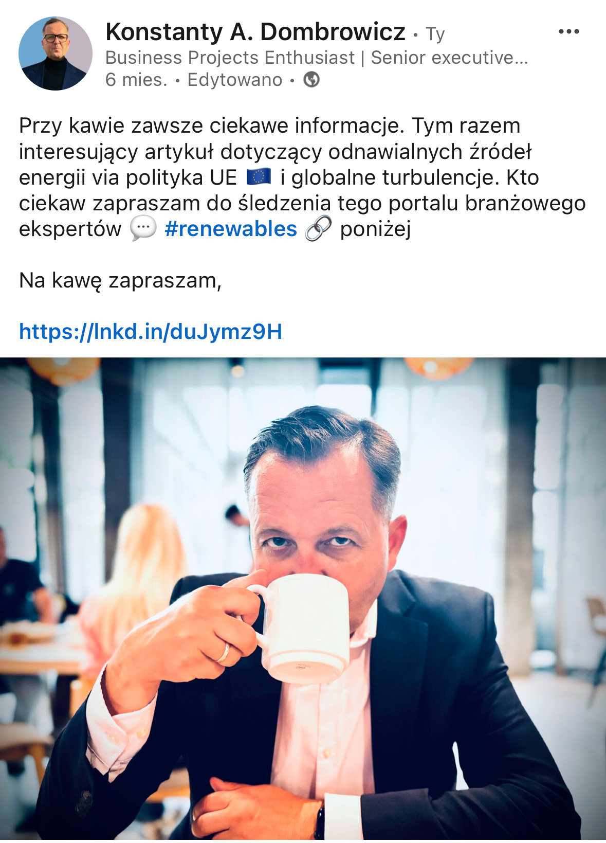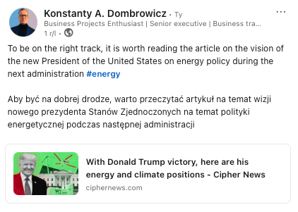 "Starannie dobieram zakres spraw, które mogę wykonywać i w całości się im poświęcić. Tematy jakie mnie interesują koncentrują się w wokół branży energetycznej - w tym sektora automotive EV oraz zielonych technologii - renewables (OZE), ale i innowacji produktów rynkowych w kategorii new biznes. Uważam, że w tym zakresie jest jeszcze wiele do zrobienia, tak w Polsce jak i szerzej Europie, a sprawy transformacji klimatycznej wymagają wsparcia na różnych polach pracy, bo nikt za Nas tego nie zrobi dla pomyślności przyszłych pokoleń.