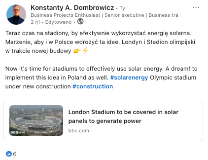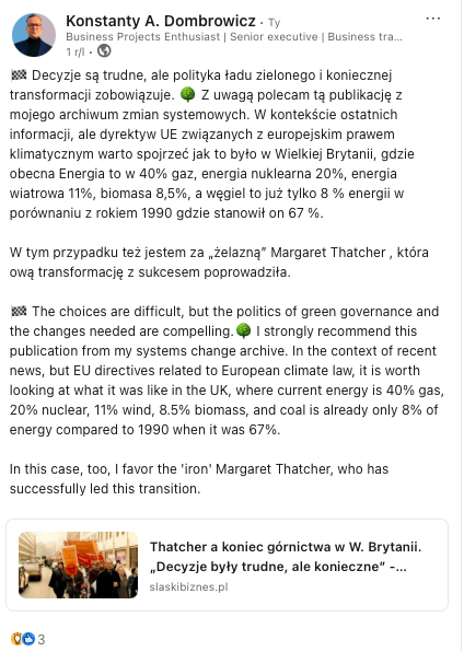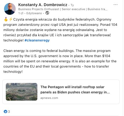 Czytelne dyrektywy UE, prawodawstwo krajowe, regulacje sektorowe i branżowe, a i globalne cele w tym wyścigu o nowe jutro - zmieniania świata kierunkują nas do działania, tak jako jednostki oraz jako zespół entuzjastów - pasjonatów gotowych na zmianę. Tylko ona jest gwarancją rozwoju technologicznego i dynamicznego wzrostu dla gospodarek narodowych 🏙️. Przykładów dla sprawiedliwej transformacji jest już na rynku europejskim bardzo wiele i należy je wspierać, 🌱 , a i życie napisane zmiana technologii i inwestycji jest kopalnią pomysłów: idei i strategii do wykonania 🚶🏃🏻♀️."