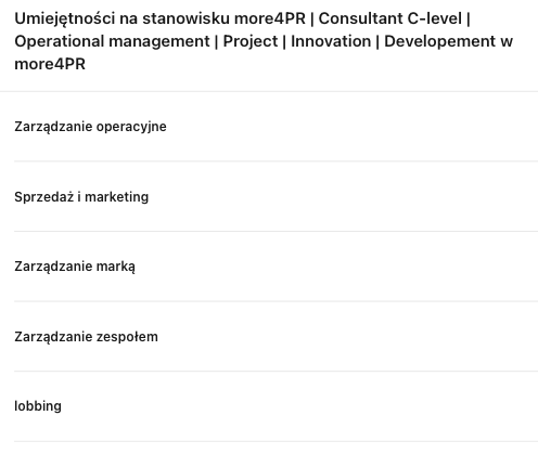 MARKETING | PROMOCJA | SPRZEDAŻ | BUDOWA ZESPOŁU | RELACJE GOSPODARCZE | PUBLIC RELATIONS | PUBLIC AFFAIRS | EFEKTYWNE KAMPANIE | BRAND MANAGEMNT | REORGANIZACJA BIZNESOWA | POZYSKIWANIE PROJEKTÓW | RELAIZACJA I TWORZENIE STATEGII DZIAŁANOSCI | LOBBING GOSPOADRCZY |