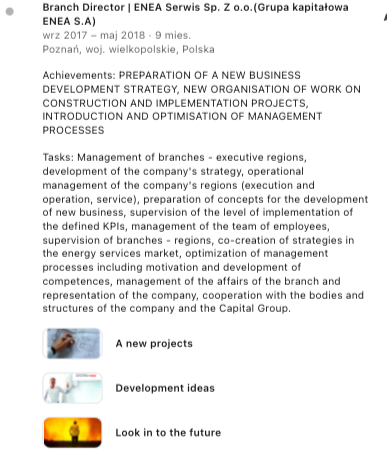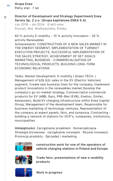 Dyrektor Oddziału Wykonawczego, a następnie Dyrektor Departamentu Strategii i Rozwoju w jednej ze spółek Grupy Kapitałowej Enea- wicelidera produkcji energii elektrycznej w Polsce.
