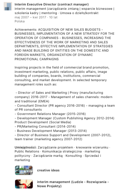 📍 Liderowania zmianom w energetyce, innowacjach, zielonych technologiach, zarządzaniu projektami zmiany, nowych projekcjach biznesowych w wielu sektorach. Skuteczne prowadzenie kampanii promocyjnych z zakresu kształtowania i budowy wizerunku nowych organizacji w tym marketing polityczny.