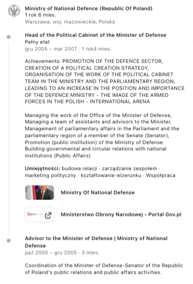2005 - 2007 Doradca Ministra, Dyrektor Gabinetu Politycznego Ministra Obrony Narodowej