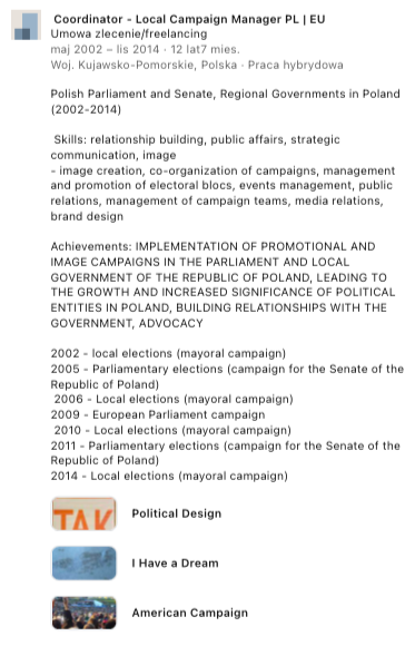 2002, 2005, 2006, 2009, 2010, 2011, 2014 Doradca | Koordynator - Manager kampanii samorządowych, parlamentarnych w Polsce (Senat RP, Samorząd Lokalny):
