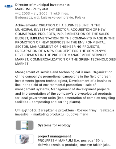 Realizacja instalacji komunalnych, promocja usług: produkcyjnych, usług serwisowych, project management inwestycji (fabryki do recyklingu), zarządzanie projektem rozwojowym. PL