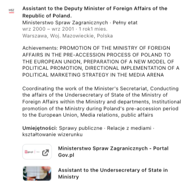 2000- 2001 Asystent Wiceministra Spraw Zagranicznych,
